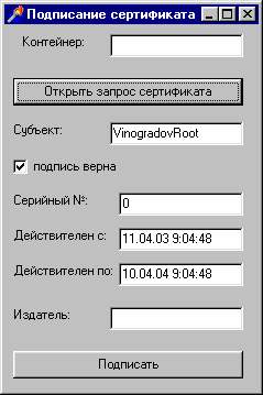 Итак, запрос сертификата создан, но что с ним делать? Если вам нужен сертификат, который можно использовать для организации безопасной связи с зарубежными партнерами, нужно отправить созданный запрос в центр сертификации, предоставив необходимые подтверждающие личность документы и уплатив соответствующую сумму. Если вы собираетесь обмениваться только в рамках сети предприятия, располагающей сервером Windows 2000 и выше, можно воспользоваться Microsoft Certificate Server. Если же вашей целью, например, является только отладка программ, или если группа, внутри которой вы собираетесь организовать обмен информацией, располагает лишь компьютерами под Windows 98 (и ниже), то можно подписать сертификат самостоятельно. Подписание сертификата При этом важно не забыть цель создания сертификата - он создавался, чтобы связь между именем пользователя и его открытым ключом удостоверялась подписью некоторой доверенной стороны. Такой "доверенный" пользователь внутри группы (будем называть его администратором) должен создать ключевую пару администратора и создать для нее сертификат, который он подписывает тем же закрытым ключом администратора. Этот сертификат называется корневым. Ключ администратора используется и для подписания сертификатов пользователей. Когда один пользователь хочет проверить подлинность сертификата другого пользователя, он проверяет подпись под ним администратора, используя для проверки тот самый корневой сертификат. Итак, сделаем из только что созданного запроса сертификата подписанный корневой сертификат. Это можно проделать при помощи функций CryptoAPI. Сама процедура в документации даже не упоминается, однако ее можно "вывести" из описания соответствующих функций. Проследим ее на примере программы, позволяющей открыть файл с запросом сертификата, проверить подпись под ним и выпустить подписанный сертификат с заданным сроком действия. Программа управляется формой, показанной на рис. 3.