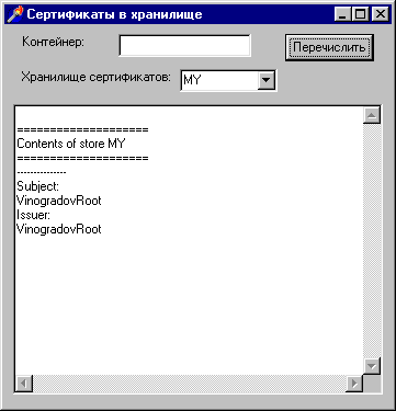 n:= nil; CertAddCertificateContextToStore (store, context, CERT_STORE_ADD_REPLACE_EXISTING, n) Функции CertAddCertificateContextToStore, кроме дескрипторов хранилища и добавляемого контекста сертификата, передается параметр, определяющий действия системы в том случае, если в данном хранилище уже имеется идентичный сертификат. Использованная константа CERT_STORE_ADD_REPLACE_EXISTING предписывает в таком случае удалить старый сертификат и заменить его новым. Последний параметр функции позволяет получить указатель на указатель на копию сертификата, созданную при добавлении контекста в хранилище (если параметр равен пустому указателю, то ссылка не возвращается). CertCloseStore (store, 0); CertFreeCertificateContext (context); FreeMem (encCert, encCertLen); Просмотреть имеющиеся в хранилище сертификаты можно с помощью функции CertEnumCertificatesInStore. Ей нужно передать дескриптор нужного хранилища и, при первом вызове, пустой указатель, а при последующих - указатель на предыдущий сертификат. Например, для просмотра содержимого одного из системных хранилищ сертификатов может быть использован следующий фрагмент программы (форма, из которой он вызывается, с результатами работы показана на рис. 5):