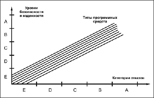 Уровни безопасности и надежности функционирования систем и ПС стандартом рекомендуется устанавливать в соответствии с категориями наиболее вероятных и опасных отказовых ситуаций в анализируемой или проектируемой системе. Уровень качества ПС также определяется возможностью возникновения потенциальных отказовых ситуаций, в результате сбоев в программах и данных, выявляемых средствами и процессами оценки безопасности. Это означает, что трудозатраты, ресурсы и время, необходимые для обеспечения согласованности с требованиями заказчика к качеству функционирования, меняются в зависимости от категорий отказовых ситуаций (см. Рис. 3 ):
