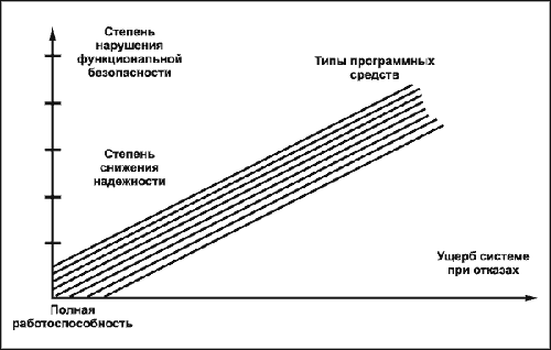 Можно предположить для простоты, что уровни функциональной безопасности и надежности линейно зависят от категории отказов и несколько отличаются для различных типов программных средств (см. Рис. 2 ). Эти зависимости можно интерпретировать, как снижение работоспособности системы или ПС в результате проявления некоторого ущерба — риска. Ущерб при отказах проявляется либо в снижении надежности при функционировании, либо, в худшем случае, как нарушение функциональной безопасности ( Рис. 3 ). Таким образом, категории отказовых ситуаций, величина ущерба — риска, трудоемкость и длительность восстановления нормального функционирования системы могут рассматриваться как база для оценивания и категоризации пороговых уровней в требованиях к безопасности и/или надежности функционирования и применения систем и их программных средств.