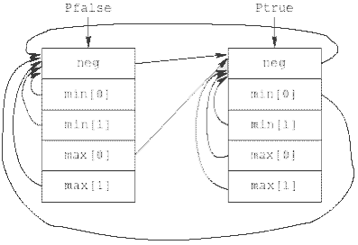 Создадим в начале работы программы в динамической памяти ссылочную структуру, показанную на рис. 9. Здесь элемент, на который указывает Pfalse, соответствует логическому значению "ложь", а элемент, на который указывает Ptrue, соответствует логическому значению "истина". Рассмотрим каждую булевскую операцию и поставим ей в соответствие операцию над указателями в созданной структуре данных.