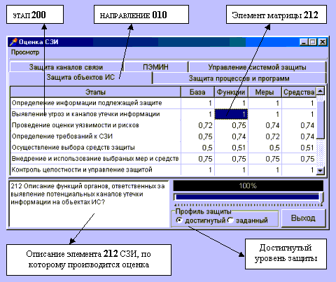 Рис. 9. Интерфейс ввода данных На рис. 10 можно посмотреть графическеое представление количественных и качественных оценок по каждому из элементов матрицы. Здесь наглядно показано как сравнивается заданный уровень безопасности с достигнутым.
