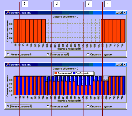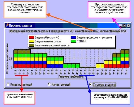 Рис. 10. Сравнение заданного и достигнутого уровеней безопасности. Далее с помощью интерфейса на рис 11. имеется возможность получить представление о ситеме защиты в целом. Ее эффектиность наглядно отражена графически, а также расчитана в виде обобщенных показателей уровня безопаности (количественного и качественного)