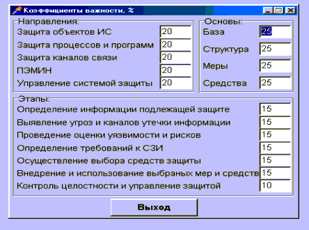 Рис. 11. Графичекое представление оценки эффетивности СЗИ. Не стоит забывать, что требования к СЗИ имеют разную степень важности, которую необходимо учитывать при расчетах, используя соответствующие коэффициенты важности. Интерфес для ввода коэффициентов важности представлен на рис. 12.