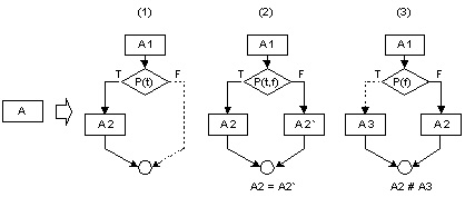 Обфускация переупорядочивания. Заключается в изменении последовательности объявления переменных, внутреннего расположения хранилищ данных, а также переупорядочивании методов, массивов (использование нетривиального представления многомерных массивов), определенных полей в структурах и т.д. 5.3 Обфускация управленияОбфускация такого вида осуществляет запутывание потока управления, то есть последовательности выполнения программного кода. Большинство ее реализаций основывается на использовании непрозрачных предикат, в качестве, которых выступают, последовательности операций, результат работы которых сложно определить (само понятие "предикат" выражает свойство одного объекта (аргумента), или отношения между несколькими объектами). Определение. Предикат "Р" считается непрозрачным предикатом, если его результат известен только в процессе обфускации, то есть после осуществления процесса обфускации, определение значения такого предиката, становится трудным. Обозначим непрозрачный предикат, возвращающий всегда значение TRUE как "Р(t)", а возвращающий значение FALSE, как "Р(f)", тогда непрозрачный предикат, который может возвратить любое из этих двух значений (то есть или TRUE, или FALSE, что нам неизвестно) как "Р(t,f)". Эти обозначения, будут использоваться дальше в контексте описания обфускации управления. Непрозрачные предикаты могут быть: