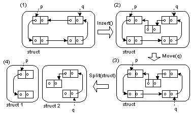 На следующих этапах процедура "Insert()" добавляет в эту структуру новый элемент, "Рисунок 0111(2)", и изменяет значение указателя "q", "Рисунок 0111(3)", при этом условие для указателей "p, q" продолжает оставаться неизменным. После выполнения следующей процедуры, происходит разделение динамической структуры, на две отдельные, таким образом, что указатели "p, q" теперь указывают на элементы, которые находятся в различных структурах, "Рисунок 0111(4)", и поэтому для них теперь справедливо иное условие: