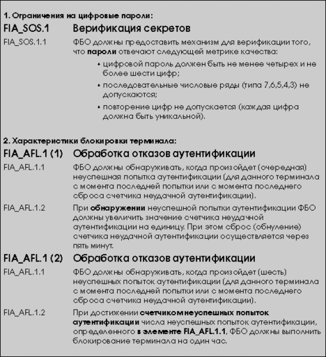 Когда значение фактора оказывается близким к границе диапазона, то оценщику следует подумать об использовании значения, усредняющего табличные. Например, если для использования уязвимости требуется доступ к ОО в течение одного часа или если доступ обнаруживается очень быстро, то для этого фактора может быть выбрано значение между 0 и 4. Для конкретной уязвимости может возникнуть необходимость сделать несколько проходов (Таб. 2) для различных сценариев нападения (например, попеременно использовать разные значения компетентности в сочетании с определенными значениями факторов времени или оборудования). При этом ориентироваться нужно на наименьшее значение, полученное для этих проходов. В случае уязвимости, которая уже идентифицирована и информация о которой общедоступна, значения "при идентификации уязвимости" нарушителем (столбец 3 Таб. 2) следует выбирать, исходя из раскрытия этой уязвимости в общедоступных источниках, а не из начальной ее идентификации нарушителем. Пример анализа стойкости функции безопасностиРассмотрим пример анализа СФБ для гипотетического механизма цифрового пароля. Информация, полученная из ЗБ и свидетельств проекта, показывает, что идентификация и аутентификация предоставляют основу для управления доступом к сетевым ресурсам с терминалов, расположенных далеко друг от друга. Управление физическим доступом к терминалам каким-либо эффективным способом не осуществляется. Управление продолжительностью доступа к терминалу каким-либо эффективным способом не осуществляется. Уполномоченные пользователи системы подбирают себе свои собственные цифровые пароли для входа в систему во время начальной авторизации использования системы и в дальнейшем — по запросу пользователя. Система содержит ограничения на цифровые пароли, выбираемые пользователем. Эти исходные данные получены на основе анализа функциональных требований безопасности из ЗБ (Рис. 3). Предполагается, что пароли состоят не менее чем из четырех символов, являющихся цифрами. Все цифры должны быть различны. Кроме того, запрещается использовать "явно неслучайные" пароли, представляющие собой последовательно возрастающие или убывающие совокупности цифр (1234, 8765 и т.п.), и не должны быть связаны каким-либо способом с конкретным пользователем, например, с датой рождения. Число возможных значений цифровых паролей рассчитывается следующим образом: