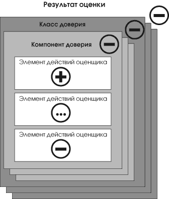 Общее заключение положительно тогда и только тогда, когда все составляющие заключения положительны. В примере, показанном на Рис. 4, заключение для одного из элементов действий оценщика отрицательно, поэтому заключения для соответствующего компонента доверия, класса доверия и общее заключение также отрицательны. В результате оценки ОО должна быть установлена степень доверия тому, что ОО соответствует требованиям, а именно: