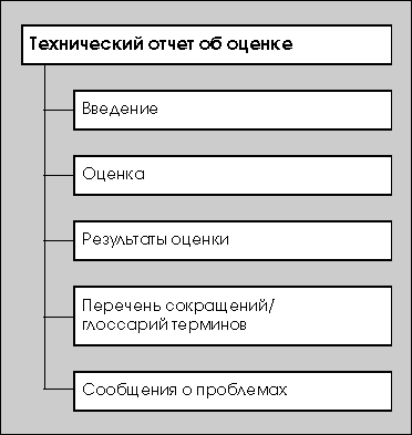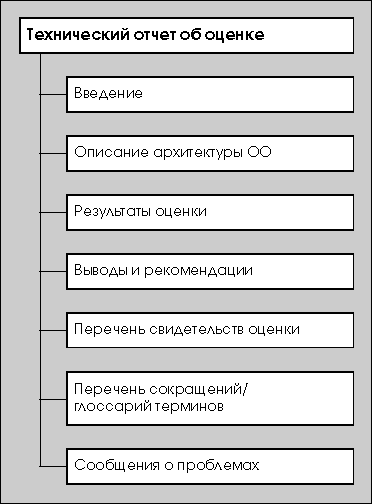 Кроме того, в данном разделе ТОО оценщик имеет возможность поместить рекомендации, которые могут оказаться полезными для органа оценки. Эти рекомендации могут иметь отношение к недостаткам ПЗ, обнаруженным в процессе оценки, или касаться тех свойств ПЗ, которые представляются особенно полезными. В разделе "Перечень сокращений/глоссарий терминов" ТОО оценщик должен привести перечень всех сокращений, используемых в ТОО, а также глоссарий используемых терминов. При этом нет необходимости в ТОО повторять определения терминов, имеющихся в глоссариях ОК или ОМО. В разделе "Сообщения о проблемах" ТОО оценщик должен привести полный перечень СП, выпущенных в процессе оценки, а также их текущий статус. Для каждого СП в перечне следует привести идентификатор СП, а также его название или аннотацию. Технический отчет об оценке объекта оценки (продукта или системы ИТ)Содержание ТОО, отражающего результаты оценки ОО, представлено на Рис. 6. В разделе "Введение" ТОО оценщик должен привести следующую информацию: