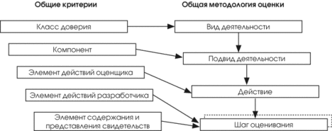Эти принципы нашли отражение при описании представленных в методологии видов деятельности по оценке. Между структурой ОК (класс — семейство — компонент — элемент) и структурой ОМО (вид деятельности — подвид деятельности — действие — шаг оценивания) была установлена прямая взаимосвязь. Рис. 1 иллюстрирует соответствие между такими конструкциями ОК, как классы, компоненты и элементы действий оценщика, и рассматриваемыми в ОМО видами деятельности, подвидами деятельности и действиями. Вместе с тем, некоторые шаги оценивания ОМО могут прямо следовать из требований ОК, содержащихся в элементах действий разработчика, содержания и представления свидетельств. В ОМО термин "Вид деятельности" ("activity") используется для описания применения класса доверия из части 3 ОК. Для описания применения компонента доверия из части 3 ОК используется термин "Подвид деятельности" ("sub-activity"). Заметим, что семейства доверия прямо не рассматриваются в ОМО, поскольку при проведении оценки всегда используется только один компонент доверия из применяемого семейства. В свою очередь, с элементом действий оценщика из части 3 ОК связан термин "Действие" ("action"). Эти действия или сформулированы в явном виде как действия оценщика, или неявно следуют из действий разработчика (подразумеваемые действия оценщика) в рамках компонентов доверия из части 3 ОК. Термин "Шаг оценивания" ("work unit") описывает неразделимый фрагмент работы по оценке. Каждое действие в ОМО включает один или несколько шагов оценивания, которые сгруппированы по элементам содержания и представления или действий разработчика соответствующего компонента из части 3 ОК. Шаги оценивания представлены в ОМО в том же порядке, что и элементы ОК, из которых они следуют. Шаги оценивания содержат обязательные действия, которые оценщик должен выполнить, чтобы прийти к заключению. Текст, сопровождающий шаги оценивания, содержит дальнейшие разъяснения использования формулировок ОК при оценке. Хотя сопроводительный текст не предписывает обязательные меры, он дает представление о том, что ожидается от оценщика при удовлетворении обязательных аспектов шагов оценивания. ОМО разбита на следующие главы:
