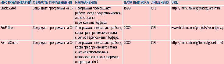 StackGuard выявляет дефект «разрушение стека» в процессе его возникновения за счет проверок целостности в записях активации вызовов функций, используя для этого метод проверки целостности canary («осведомитель») (рис. 1). Компилятор генерирует код, который вставляет специальный фрагмент в записи активации при вызовах функций, и проверяет их при возврате функций. Если происходит переполнение буфера типа «разрушение стека», специальный фрагмент будет искажен; код возврата при этом прекращает работу программы, а не передает управление на адрес, указываемый в искаженной записи активации. StackGuard широко применяется с лета 1998 года. Разработчики используют его для создания полных версий Immunix Linux на основе Red Hat 5.2, 6.2 и 7.0. Однако StackGuard 2 (текущая версия) базируется на GCC 2.91.66, а в период подготовки статьи был практически завершен перенос на GCC 3.2. Распространяется на условиях лицензии GPL. ProPoliceProPolice — программа, аналогичная StackGuard, но обладающая несколькими дополнительными возможностями.