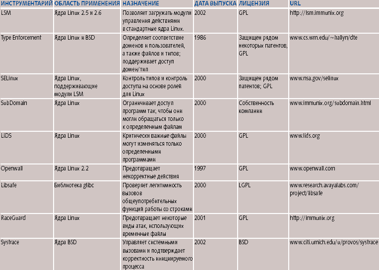 StackGuard добавляет свои инструкции после этапа оптимизации, чтобы «осведомители» не были удалены или искажены. ProPolice помещает свои проверки на абстрактный уровень синтаксического дерева GCC, рискуя тем, что компилятор может помешать выполнению проверок, поместив их туда, где они будут неэффективными. FormatGuardFormatGuard аналогичен StackGuard: он выявляет и прекращает работу программы в случае использования уязвимых мест в строке формата printf [12]. FormatGuard был первым инструментарием, созданным для предотвращения использования уязвимых мест в строке формата оператора printf. В FormatGuard применяются макросы препроцессора CPP для подсчета аргументов времени компиляции и вокруг функций printf формируются оболочки времени исполнения, которые устанавливают соответствие между предполагаемым числом аргументов в строке формата и реально переданным числом аргументов. FormatGuard предлагается в виде вариата glibc на условиях LGPL. Управление поведениемУправление поведением реализует защиту, которая эффективна только во время исполнения. Обычно это осуществляется с помощью библиотек или ядра операционной системы. В таблице 3 дано краткое описание существующих инструментов управления поведением. Linux Security ModulesБлагодаря своей популярности и открытому коду, ОС Linux стала объектом большого числа исследований, посвященных совершенствованию модели контроля доступа. Однако наиболее перспективные системы защиты для большинства остаются недоступными. Их использование требует возможности компилировать и устанавливать настраиваемые ядра, что является серьезным препятствием для тех, кто по роду своей деятельности не связан с разработкой ядер Linux. Проект Linux Security Modules (LSM) [13] призван решить эту проблему за счет создания единого модульного интерфейса в ядре Linux, чтобы пользователи могли загружать усовершенствованные системы контроля доступа в стандартных ядрах Linux; после чего конечные пользователи могли бы адаптировать эти системы к своим требованиям. Для этого в рамках LSM необходимо добиться следующего.