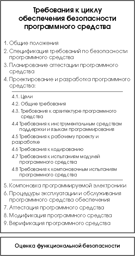 Планирование функциональной безопасности ПС должно определять стратегию получения, разработки, компоновки, верификации, аттестации и модификации комплекса программ в той мере, которая необходима для требуемого уровня соответствия ПЭС комплексу требований по безопасности. Требования к циклу обеспечения безопасности программных средствОбщие положенияЦикл обеспечения безопасности при разработке ПС должен быть выбран и задан при планировании безопасности, приспособлен для практических нужд проекта или организации. В деятельность, связанную с циклом обеспечения безопасности, должны быть включены процедуры гарантирования качества и безопасности. Каждый этап цикла обеспечения безопасности ПС должен быть подразделён на элементарные операции в рамках сферы действия, а также входных и выходных данных, оговоренных для каждого этапа. Полный перечень этапов цикла обеспечения безопасности подходит для больших вновь разрабатываемых систем. В малых системах может оказаться целесообразным объединять этапы проектирования ПС и архитектурного проектирования объекта или системы. Рекомендуется использовать основные положения, комплекс этапов и работ, представленный в стандарте ISO 12207 . Для каждого этапа цикла обеспечения безопасности должны использоваться соответствующие методы и меры. По результатам деятельности в рамках цикла обеспечения безопасности ПС должна быть составлена документация. Если на любом этапе обеспечения безопасности ПС потребуется изменение, относящееся к более раннему этапу, то более ранний и последующие этапы цикла обеспечения безопасности должны быть повторены.