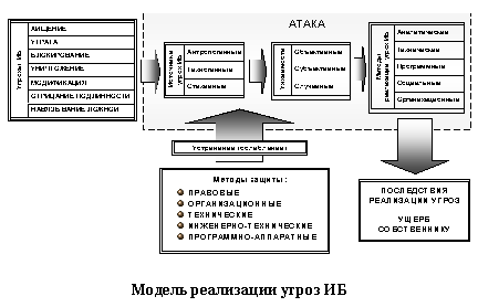 Методы реализации можно разделить на группы по способам реализации (рис. 4). При этом необходимо учитывать, что само понятие "метод", применимо только при рассмотрении реализации угроз антропогенными источниками. Для техногенных и стихийных источников, это понятие трансформируется в понятие "предпосылка".