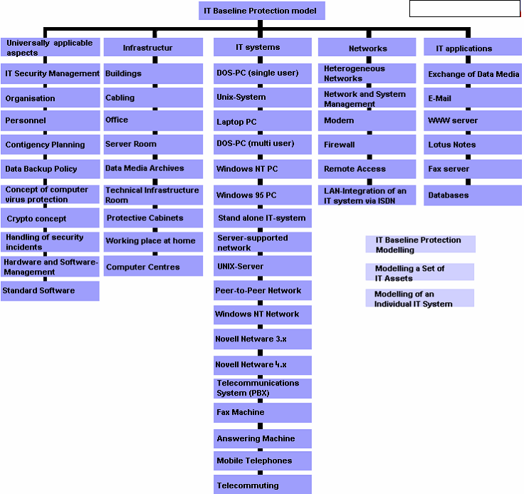 Сегодня общими вопросами управления информационной безопасности компаний и организаций, а также развитием аудита безопасности на требования стандарта BS 7799 занимаются международный комитет Joint Technical Committee ISO/IEC JTC 1 совместно с Британским Институтом Стандартов- British Standards Institution(BSI) - (www.bsi-global.com), и в частности служба UKAS (United Kingdom Accredited Service). Названная служба производит аккредитацию организаций на право аудита информационной безопасностью в соответствии со стандартом ВS ISO/IEC 7799:2000 (BS 7799-1:2000). Сертификаты, выданные этими органами, признаются во многих странах. Отметим, что в случае сертификации компании по стандартам ISO 9001 или ISO 9002 стандарт ВS ISO/IEC 7799:2000 (BS 7799-1:2000) разрешает совместить сертификацию системы информационной безопасности с сертификацией на соответствие стандартам ISO 9001 или 9002 как на первоначальном этапе, так и при контрольных проверках. Для этого необходимо выполнить условие участия в совмещенной сертификации зарегистрированного аудитора по стандарту ВS ISO/IEC 7799:2000 (BS 7799-1:2000). При этом в планах совместного тестирования должно быть четко указаны процедуры проверки системы информационной безопасности, а сертифицирующие органы должны гарантировать тщательность проверки информационной безопасности. В сентябре 2002 года международный стандарт ISO 17799 (BS7799) был пересмотрен и существенно дополнен. В новом варианте этого стандарта много внимания уделено вопросам вопросам повышения культуры защиты информации в различных международных компаниях, в том числе вопросам обучения и изначальной интеграции процедур и механизмов оценки и управления информационной безопасности в информационные технологии корпоративных систем. По мнению специалистов, обновление международного стандарта ISO 17799 (BS7799) позволит не только создать новую культуру защиты информационных активов компании, но и скоординировать действия различных ведущих государственных и коммерческих структур в области защиты информации. Ниже в табл. 1 приведено сравнение содержания стандартов ISO 17799 (BS 7799) разных версий и ISO 9001, в котором рассматривается близкий круг вопросов управления информационной безопасностью. Таблица 1. Сравнение содержания стандартов ISO 17799 и ISO 9001 Германский стандарт BSI В отличие от ISO 17799 германское "Руководство по защите информационных технологий для базового уровня защищенности" 1998 посвящено детальному рассмотрению частных вопросов управления информационной безопасности компании. Это руководство представляет собой гипертекстовый электронный учебник объемом примерно 4 МБ (в формате HTML). Общая структура германского стандарта BSI приведена на рис 1. Рис 1 Структура германского стандарта BSI. В германском стандарте BSI представлены: