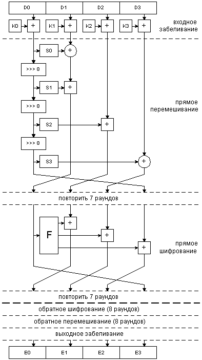 Финалист AES шифр MARSШифр состоит из трех видов операций, которые повторяются сначала в прямом, а затем в инверсном порядке. На первом шаге идет классическое входное забеливание : ко всем байтам исходного текста добавляются байты из материала ключа. Второй этап : прямое перемешивание, однотипная операция, имеющая структуру сети Фейштеля повторяется 8 раз. Однако, на этом этапе не производится добавление материала ключа. Цель данного преобразования тщательная рандомизация данных и повышение стойкости шифра к некоторым видам атак (рис.1). Третий этап : собственно шифрование. В нем используется сеть Фейштеля треьего типа с 4 ветвями, то есть значения трех функций, вычисленных от одной ветви накладываются соответственно на три других, затем идет перестановка машинных слов. Эта операция также повторяется 8 раз (рис.1). Именно на этом этапе происходит смешивание текста с основной (большей) частью материала ключа. Сами функции, накладываемые на ветви, изображены на рис.2. Как видим, в алгоритме MARS использованы практически все виды операций, применяемых в криптографических преобразованиях : сложение, "исключающее ИЛИ", сдвиг на фиксированное число бит, сдвиг на переменное число бит, умножение и табличные подстановки. Во второй части операции шифрования повторяются те же операции, но в обратном порядке : сначала шифрование, затем перемешивание, и, наконец, забеливание. При этом во вторые варианты всех операций внесены некоторые изменения таким образом, чтобы криптоалгоритм в целом стал абсолютно симметричным. То есть, в алгоритме MARS для любого X выполняется выражение EnCrypt(EnCrypt(X))=X