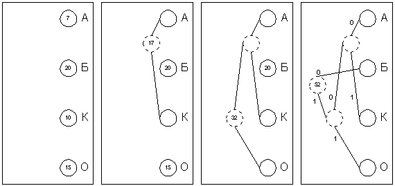 Алгоритм ХаффманаАлгоритм основан на том факте, что некоторые символы из стандартного 256-символьного набора в произвольном тексте могут встречаться чаще среднего периода повтора, а другие, соответственно, реже. Следовательно, если для записи распространенных символов использовать короткие последовательности бит, длиной меньше 8, а для записи редких символов длинные, то суммарный объем файла уменьшится. Хаффман предложил очень простой алгоритм определения того, какой символ необходимо кодировать каким кодом для получения файла с длиной, очень близкой к его энтропии (то есть информационной насыщенности). Пусть у нас имеется список всех символов, встречающихся в исходном тексте, причем известно количество появлений каждого символа в нем. Выпишем их вертикально в ряд в виде ячеек будущего графа по правому краю листа (рис. 1а). Выберем два символа с наименьшим количеством повторений в тексте (если три или большее число символов имеют одинаковые значения, выбираем любые два из них). Проведем от них линии влево к новой вершине графа и запишем в нее значение, равное сумме частот повторения каждого из объединяемых символов (рис.2б). Отныне не будем принимать во внимание при поиске наименьших частот повторения два объединенных узла (для этого сотрем числа в этих двух вершинах), но будем рассматривать новую вершину как полноценную ячейку с частотой появления, равной сумме частот появления двух соединившихся вершин. Будем повторять операцию объединения вершин до тех пор, пока не придем к одной вершине с числом (рис.2в и 2г). Для проверки: очевидно, что в ней будет записана длина кодируемого файла. Теперь расставим на двух ребрах графа, исходящих из каждой вершины, биты 0 и 1 произвольно например, на каждом верхнем ребре 0, а на каждом нижнем 1. Теперь для определения кода каждой конкретной буквы необходимо просто пройти от вершины дерева до нее, выписывая нули и единицы по маршруту следования. Для рисунка 4.5 символ "А" получает код "000", символ "Б" код "01", символ "К" код "001", а символ "О" код "1".