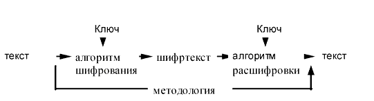 Согласно методологии сначала к тексту применяются алгоритм шифрования и ключ для получения из него шифртекста. Затем шифртекст передается к месту назначения, где тот же самый алгоритм используется для его расшифровки, чтобы получить снова текст. Также в методологию входят процедуры создания ключей и их распространения (не показанные на рисунке).