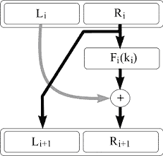 Архитектура разбалансированной сети Файстеля выглядит весьма похоже на архитектуру обычной сети и определяется таким же способом. Единственное, но весьма существенное отличие состоит в том, что, поскольку используется разбиение не на равные половинки блока, а на участки различной длины, функция гаммирования, обозначенная буквой "F", может зависеть не от всех битов исходного блока данных или иметь разные зависимости в разных раундах. Собственно говоря, разбалансированную сеть Файстеля можно рассматривать как обобщение понятия сети Файстеля. Стойкость криптосистемы, построенной на основе сети Файстеля, зависит целиком от результата исполнения нелинейной функции гаммирования в нескольких итерациях. Поэтому для обеспечения достаточной надежности данные должны быть преобразованы с достаточно большим числом раундов, что позволяет достичь требуемых свойств рассеивания и полноты и соответственно стойкости шифра к дифференциальному и линейному криптоанализу (см. раздел "Современные методы криптоанализа").