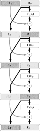 Рис. 4.2. Сеть Файстеля с несколькими раундами Исходя из данного описания, преобразование данных одного раунда можно представить с помощью двух формул, выражающих новые значения левой и правой половинок блока шифруемых данных: