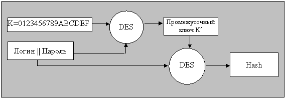 Обозначим шифрование строки Х на ключе K как DES(X,K). Тогда, в аналитической форме уравнение шифрования выглядит так: H = DES(UPPER(Логин||Пароль), DES(UPPER(Логин||Пароль), K)) (1) Если обозначить UPPER(Логин||Пароль) =Х, то уравнение станет совсем простым: H=DES(X,DES(X,K)) (2) Обратную операцию (расшифрование H на ключе K) обозначим так: X=DES-1(H,K).