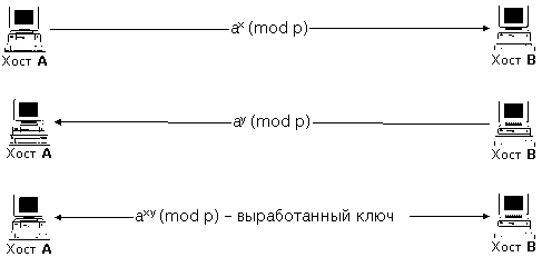 Поэтому один из ключей может быть опубликован. При опубликованном (открытом) ключе шифрования и секретном ключе дешифрования получается система шифрования с открытым ключом. Каждый пользователь сети связи может зашифровать сообщение при помощи открытого ключа, а расшифровать его сможет только владелец секретного ключа. При опубликовании ключа дешифрования получается система цифровой подписи. Здесь только владелец секретного ключа создания подписи может правильно зашифровать текст (т.е. подписать его), а проверить подпись (дешифровать текст) может любой на основании опубликованного ключа проверки подписи. В 1976 г. У. Диффи и М. Хеллман предложили следующий метод открытого распределения ключей. Пусть два объекта A и B условились о выборе в качестве общей начальной информации большого простого числа p и примитивного корня степени p - 1 из 1 в поле вычетов по модулю p. Тогда эти пользователи действуют в соответствии с протоколом (рис. 6.4): A вырабатывает случайное число x, вычисляет число ax (mod p) и посылает его B; B вырабатывает случайное число y, вычисляет число ay (mod p) и посылает его A; затем A и B возводят полученное число в степень со своим показателем и получают число axy (mod p).