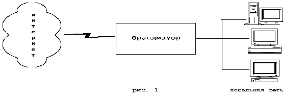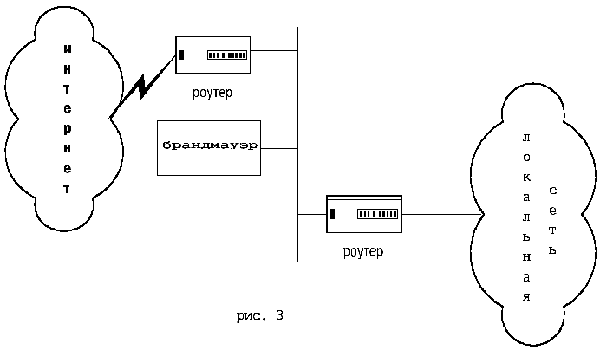 Виртуальные сетиРяд брандмауэров позволяет также организовывать виртуальные корпоративные сети ( Virtual Private Network), т.е. объединить несколько локальных сетей, включенных в INTERNET в одну виртуальную сеть. VPN позволяют организовать прозрачное для пользователей соединение локальных сетей, сохраняя секретность и целостность передаваемой информации с помощью шифрования. При этом при передаче по INTERNET шифруются не только данные пользователя, но и сетевая информация - сетевые адреса, номера портов и т.д. Схемы подключенияДля подключения брандмауэров используются различные схемы. Брандмауэр может использоваться в качестве внешнего роутера, используя поддерживаемые типы устройств для подключения к внешней сети (см рис. 1). Иногда используется схема, изображенная на рис 3, однако пользоваться ей следует только в крайнем случае, поскольку требуется очень аккуратная настройка роутеров и небольшие ошибки могут образовать серьезные дыры в защите.