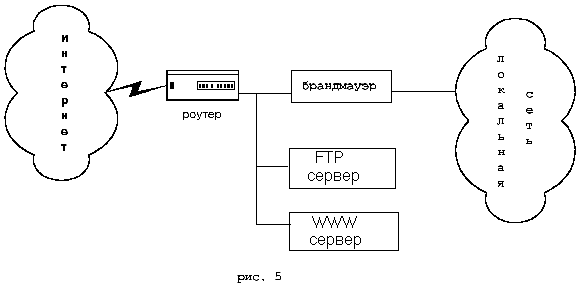 Если брандмауэр может поддерживать два Ethernet интерфейса (так называемый dual-homed брандмауэр), то чаще всего подключение осуществляется через внешний маршрутизатор (см рис. 4).