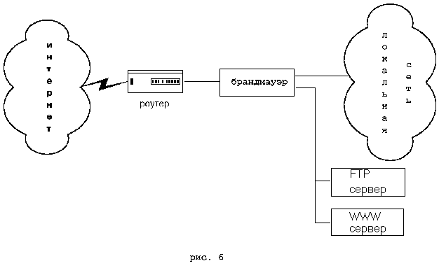 При этом брандмауэром защищается только одна подсеть из нескольких выходящих из роутера. В незащищаемой брандмауэром области часто располагают серверы, которые должны быть видимы снаружи (WWW, FTP и т.д.). Некоторые брандмауэры предлагают разместить эти сервера на нем самом - решение, далеко не лучшее с точки зрения загрузки машины и безопасности самого брандмауэра Существуют решения (см рис. 6),которые позволяют организовать для серверов, которые должны быть видимы снаружи, третью сеть; это позволяет обеспечить контроль за доступом к ним, сохраняя в то же время необходимый уровень защиты машин в основной сети.