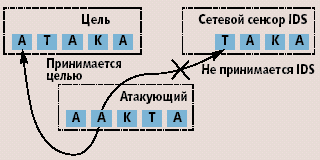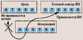 Передаваемая по сети информация может быть по-разному обработана IDS и целевой системой, а из-за различий в стеках протоколов появляется возможность создать последовательность пакетов, которая будет принята IDS, но отвергнута целевой системой. В таком случае IDS не знает, что целевая система не приняла пакет, и атакующий может воспользоваться этим для сокрытия факта проведения атаки, посылая специально созданные пакеты. Создавая ситуацию, когда целевая система отбрасывает пакеты, а система обнаружения атак их принимает, нарушитель как бы «вставляет» данные в анализатор событий IDS (рис. 1).