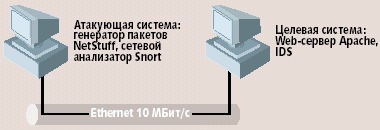 Проведение тестированияТестирование реализации стеков операционной системы и IDS проводилось на макете, состоящем из двух компьютеров, объединенных сетью Ethernet. Хост, с которого проводилось тестирование, назывался «атакующей системой», а тестируемый хост — «целевой системой» (рис. 3). На хосте имелся файл с названием PHF. Доступ к данному файлу моделировал доступ к уязвимому сценарию phf (www.infosecurity.com/archive/1). В случае HTTP-запроса с атакующей системы к этому файлу Web-сервер передавал его содержимое атакующему, что говорило об успехе атаки. Совсем необязательно выполнять сам сценарий на Web-сервере: если Web-сервер выдал содержимое файла, можно считать, что атака состоялась. Атакующий мог видеть результат атаки на экране с помощью запущенного сетевого анализатора Snort. В случае успеха Snort перехватывал содержимое файла PHF. Обращение к файлу PHF выбрано не случайно. Во-первых, в [1] рассматривали также обращение к PHF. Во-вторых, данная уязвимость была обнаружена в 1996 году и все рассмотренные IDS имели правила для поиска такой сигнатуры.