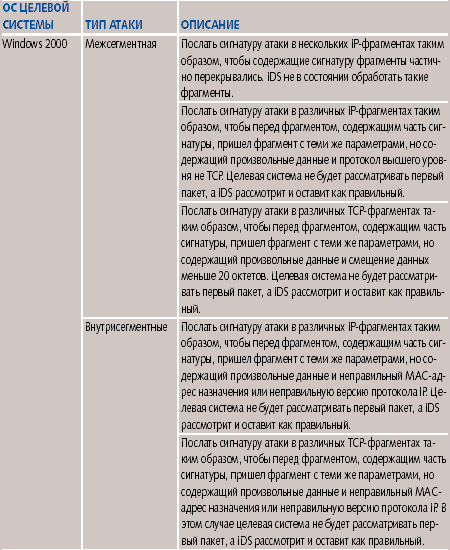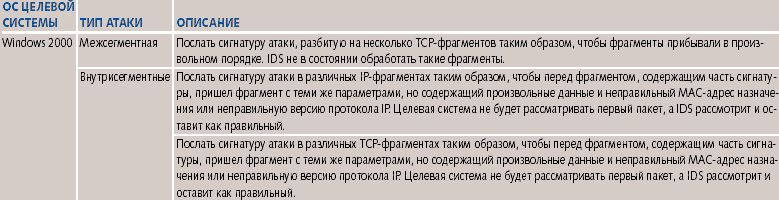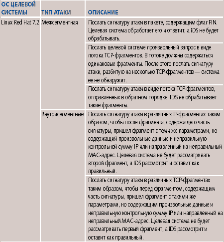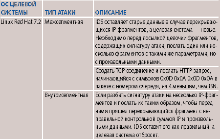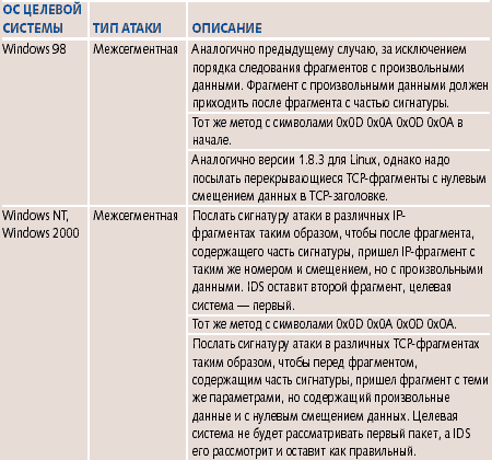 Как показали дальнейшие исследования, все обнаруженные различия можно использовать при проведении сокрытых сигнатурных атак при помощи методов вставки и уклонения. Поиск уязвимостейПоиск уязвимостей IDS был проведен посредством посылки запросов целевой системе с работающей IDS. Запрос формировался с учетом обнаруженных ранее различий. Успешное сокрытие атаки позволяло говорить о том, что найдена уязвимость. Описание некоторых методов сокрытия сигнатурных атак, использующих найденные уязвимости в зависимости от операционной системы целевой системы, типа атаки и используемой системы обнаружения, представлены в таблицах 1-5. Методы, которые можно использовать для сокрытия атак через Internet, отнесены к классу межсегментных. Если же метод подходит только для атак внутри одной сети, он отнесен к внутрисегментному классу. Как выяснилось, существуют уязвимости IDS, которые можно использовать для проведения скрытой сигнатурной атаки, даже если нарушитель не знает, какая ОС установлена на целевой системе. Скажем, можно использовать тот факт, что Dragon 5.0 не воспринимает данные в TCP-сегменте с установленным флагом FIN или не в состоянии обработать некоторый фрагментированный трафик. Практически все исследованные IDS имеют такие уязвимости. Если для проведения атак используются различия в работе IDS и операционной системы, то в зависимости от того, какую операционную систему защищает IDS, могут появляться новые уязвимости. Например, мы рассмотрели только связку RealSecure 6.0/Windows 2000. А что, если RealSecure 6.0 защищает Web-сервер на платформе Linux Red Hat? Понятно, что некоторые ранее найденные уязвимости будут неактуальны. Однако, используя особенности реализации стека Linux Red Hat, полученного на первом этапе тестирования, можно обнаружить новые уязвимости. Используя результаты, полученные после поиска различий, нарушитель может разработать методы сокрытия для любых комбинаций IDS и ОС. Для этого ему необходимо выяснить, какая IDS защищает конкретный сегмент сети. Это основная проблема — особенно, если нарушитель находится вне сегмента. Если же нарушитель находится в том же сегменте сети, то появляется возможность определить тип IDS по служебной информации, которой IDS обменивается со своими агентами и сенсорами (если имеется распределенная архитектура IDS). После этого, используя генератор пакетов и проведя несколько тестирующих легальных запросов на целевую систему, нарушитель определяет особенности ее работы. Скажем, он может проанализировать, как обрабатывается фрагментированный трафик. Далее, используя базу данных с особенностями работы конкретной IDS и результатами тестирования, нарушитель сможет найти различия и сгенерировать такую последовательность пакетов, которая позволит незаметно провести сигнатурную атаку. ВыводыВ качестве исследуемых IDS выбирались наиболее популярные системы. Факт наличия в них уязвимостей позволяет говорить о том, что и в остальных доступных инструментах ситуация будет не лучше. С точки зрения возможности применения методов вставки и уклонения, самыми уязвимыми оказались Dragon 5.0 и eTrust 1.0. Поэтому, если нарушитель знает, что сегмент сети защищен системой обнаружения вторжений Dragon 5.0, то он имеет возможность провести сигнатурную атаку, скрыв ее, например, при помощи модификации потока TCP-фрагментов. eTrust 1.0 оказалась лучше Dragon