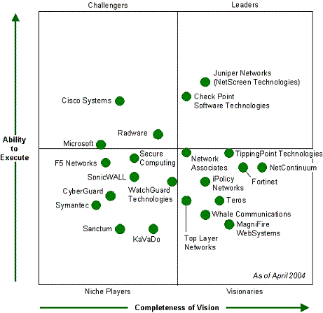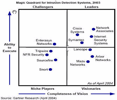 Диаграмма 3. Magic Quadrant for Extranet Access Management, 1H04 Средства обнаружения вторжений и аномалийСредства обнаружения вторжений, IDS (Intrusion Detection Systems) и аномалий позволяют с помощью некоторого регламента проверок контролировать состояние безопасности корпоративной сети в реальном масштабе времени. Общий анализ рынка систем обнаружений и аномалий представлен на диаграмме 4.