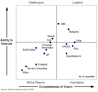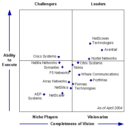 Диаграмма 2. Magic Quadrant for SSL VPNs, 4H04 Средства контроля доступаПоявление средств контроля доступа обусловлено необходимостью регламентировать доступ множества пользователей к приложениям и информационным ресурсам компании. Данные средства осуществляют аутентификацию (точное опознание) подключающихся к АС пользователей и процессов, авторизацию (наделение определенными полномочиями) пользователей и процессов. Состояние рынка средств контроля доступа представлено на диаграмме 3.