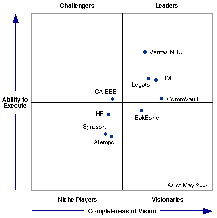 Диаграмма 4. Magic Quadrant for IDA, 4H04 Средства резервного копирования и архивированияСредства резервного копирования и архивирования применяются для обеспечения целостности хранилищ данных в случаях аппаратных и программных сбоев, ошибочных действий администраторов и пользователей, а также отказов средств вычислительной техники. Текущее состояние рынка систем резервирования представлено на диаграмме 5.