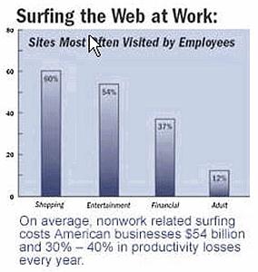 Средства мониторинга безопасностиБольшое количество средств обеспечения информационной безопасности (межсетевые экраны, системы обнаружения вторжений, маршрутизаторы, средства создания виртуальных частных сетей, журналы безопасности серверов, системы аутентификации, средства антивирусной защиты и т. д.) генерирует огромное количество сообщений. Для успешного мониторинга и управления этими средствами рекомендуется использовать соответствующие средства аудита безопасности, например Cisco Security Information Management Solution. Другие решения вы можете увидеть на диаграмме 7. Средства контроля деятельности сотрудников в InternetВ настоящее время одной из серьезных проблем в работе отечественных служб безопасности является предотвращение попыток использования Internet-ресурсов компании в личных целей (загрузка видео, аудио, картинок, нелицензионного программного обеспечения). По статистике, нецелевое использование сети Интернет приводит к потере продуктивности сотрудников компании приблизительно на 30-40% (согласно данным производителя средств защиты Surfcontrol) (см. диаграмму8).