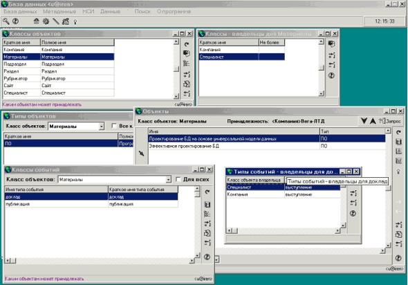 Компания организует конференцию. Детализация понятий: объекты, события, связиОбъект компания определяется именем; характеризуется: видом деятельности, временем основания, адресом в интернет, ИНН, количеством участников, факсом, телефоном, физическим адресом, юридическим адресом. Объект сайт определяется адресом в интернет; характеризуется: именем, временем создания, количеством посещений в неделю. Объект материалы определяется названием; характеризуются: датой издания, местом издания, объемом; указывает на документ, где материалы содержатся. Объект специалист определяется ФИО; может принадлежать компании; характеризуется: именем, отчеством, адресом, годом рождения, гражданством, E-mail, телефоном. Объект рубрика определяются наименованием. Объект раздел рубрики определяются наименованием; принадлежит рубрике. Объект подраздел рубрики определяются наименованием; принадлежит разделу рубрики. Событие конференция происходит с объектами компания; определяется временем проведения; характеризуется: именем, местом проведения; указывает на документ "схема проезда". События открытие, перерыв, кофе, обед, закрытие организует объект компания; в составе события конференция; определяются временем проведения. Событие выступление происходит с объектами компания или специалист; входит в событие конференция; определяется планируемым временем (по программе); характеризуется: фактическим временем. Событие доклад происходит с объектами материалы; входит в событие выступление компании или выступление специалиста; определяется планируемым временем (по программе); характеризуется: фактическим временем. Событие участвует происходит с объектами специалист; входит в событие конференция компании; определяется временем регистрации; характеризуется: временем оплаты, суммой оплаты, фактическим временем; бронирование гостиницы; категория, форма оплаты. Событие публикация происходит с объектом сайт определяется временем публикации; характеризуется адресом Событие опубликован материал; входит в событие опубликован на сайте, определяется временем публикации. Связь автор для материала определяет специалиста или компанию, которые разработали материалы. Связь классификация для материала определяет подраздел рубрики, который объединяет материалы. Пример формального описания предметной области (XML)Классы объектов: <ObjClass Name="Материалы" SName="Материалы" IsPoint="N" IsInterval="N" > <ObjType Name="Программное обеспечение" SName="ПО" /> <PropType UnitSName="стр." Name="Объём" SName="Объём" ValType="N" IsObjBound="Y" IsObjTypeBound="N" /> <EvType Name="доклад" SName="доклад" /> <EvType Name="публикация" SName="публикация" /> </ObjClass> Подчиненность классов объектов: <Ownership ChildSName="Специалист" ParentSName="Компания" MaxChildren="" /> <Ownership ChildSName="Материалы" ParentSName="Компания" MaxChildren="" /> Событий: <EvOwnership Notion="OBJECTS" ClassSName="Компания" EvTypeSName="Конференция" MaxChildren="" > <EvOwnership Notion="OBJECTS" ClassSName="Специалист" EvTypeSName="выступление" MaxChildren="" > <EvOwnership Notion="OBJECTS" ClassSName="Материалы" EvTypeSName="доклад" MaxChildren="1" /> </EvOwnership> </EvOwnership> Связи: <RelType Name="авторство" FromNotion="OBJECTS" FromClassSName="Материалы" FromAllowChildren="N" FromMaxVals="1" ToNotion="OBJECTS" ToClassSName="Специалист" ToAllowChildren="N" ToMaxChildren="" RevName="разработал" /> Пример реализации в БД
