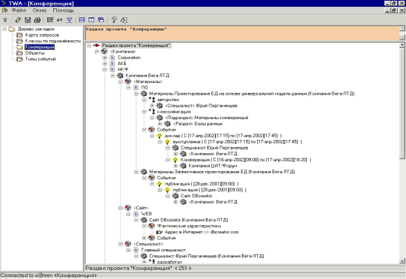 Электронная почта: perg@dbcreator.com Телефон: +380-572-474113 Факс: +380-572-195687 Адрес: 61145, Украина, г. Харьков, ул. Новгородская, 3a, ООО "Вега-ЛТД" (www.vega.kharkov.ua) Руководитель проекта: Пергаменцев Юрий Арнольдович ПриложениеРаздел проекта "Конференция", Пример БД, построенной на основе УМД Концептуальное описание предметной области понятиями УМД Обозначения: классы объектов; классы событий; классы связей
