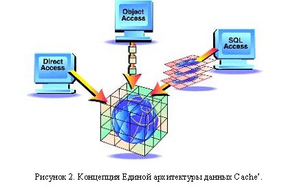 В Cache' реализована концепция Единой архитектуры данных. К одним и тем же данным, хранящимся под управлением Сервера многомерных данных Cache' есть три способа доступа: прямой, объектный и реляционный: