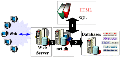 Сравнительная диаграмма Net.db с другими средствами создания интерактивных Web серверов Выполняемые из любого web-браузера приложения, созданные в Net.db, обеспечивают простой и эффективный доступ к информации из корпоративной базы данных, такой как телефонный справочник, каталог продуктов и т.д. Net.db позволяет пользователям непосредственно из Web-браузера редактировать информацию, содержащуюся в базе данных. В самой простой модификации, Net.db обеспечивает доступ "только для чтения" к данным, хранящихся в реляционных базах данных, включая изображения и диаграммы. В более продвинутом варианте Net.db - это прикладная программа, которая дает возможность создавать интерактивные Web-страницы, выполнять запросы, просматривать и модифицировать данные и их графическое представление через Web-браузер. Net.db состоит из трех компонентов: Centura Net.db Object Engine, Page Designer и Page Viewer. Object Engine управляет подключением пользователей к реляционной базе данных. Page Designer обеспечивает пользователя инструментальными средствами, необходимыми для доступа к базе данных через браузер. При помощи Page Designer создаются библиотеки, книги и страницы. Page Viewer дает возможность взаимодействовать с базой данных через браузер, используя страницы, сформированные с помощью Page Designer.
