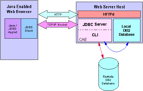 Доступ к данным через InternetDB2 Universal Database предоставляет широкую поддержку для приложений Web, что является ключевым требованием систем для электронного бизнеса Java Важнейшим свойством универсальной базы данных DB2, которое унаследовано от предыдущих версий, является интегрированные возможности полномасштабной поддержки Java. Вы можете запускать приложения Java на клиентах, которые получают доступ к данным в DB2, при помощи встроенной в DB2 поддержки JDBC (Java Database Connectivity). Ваше Java-приложение на клиенте будет обращаться к базе данных через интерфейс JDBC API. Другой путь доступа предполагает использование апплетов Java, которые будут получать доступ к универсальной базе данных DB2. Для этого клиенту необходим только Web-браузер, поддерживающий Java. Клиентскую часть DB2 или сервер должна быть инсталлирована на той же машине, где у вас установлен Web-сервер. Кроме того на сервере используется набор разработчика JDK (Java Developer Kit) компании Sun Microsystems. Когда браузер клиента встретит дескриптор HTML, указывающий на апплет Java, этот апплет и все необходимые классы, а также драйвер DB2 JDBC будут загружены на машину клиента. Когда этот апплет будет использовать интерфейс JDBC API для обращения к DB2, драйвер JDBC будет подключаться непосредственно к базе данных DB2 через сервер Java "сидящий" на сервере DB2.
