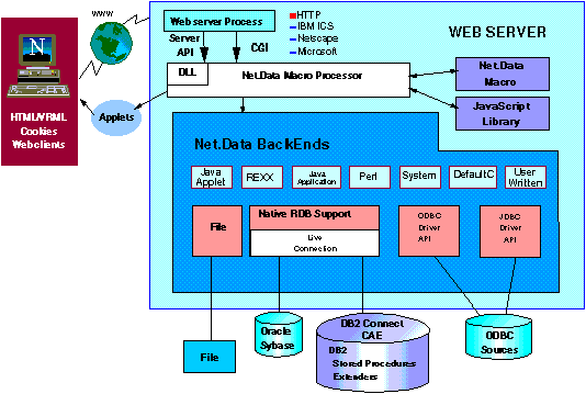 DB2 поддерживает хранимые процедуры на Java и определяемые пользователем функции(UDF), что позволяет программистам Java превратиться в создателей приложений для баз данных без особых дополнительных усилий. Новые функции версии 5.2 в этой области включают статический SQL для Java (SQLJ). С версии 5.2, все преимущества статического SQL, в первую очередь - производительность, становятся доступными для программистов на Java через поддержку стандарта SQLJ API. DB2 версия 5 является первой крупной СУБД, которая полностью и целиком поддерживает стандарты Java и дает возможность пользоваться этим языком программирования в течение всего процесса разработки. Программный продукт VisualAge for Java создает полномасштабную среду для этого процесса. Net.Data Поддержка клиентов Internet осуществляется с помощью средства IBM Net.Data. IBM Net.Data бесплатно поставляется с DB2 и поддерживает доступ через WWW к реляционным данным при помощи HTML и простой язык макросов. Net.Data тесно интегрирован с интерфейсами Web серверов и поддерживает динамическую генерацию HTML-страниц и серверную часть обработки данных с помощью приложений, написанных на Java, REXX, Perl, C++ или собственном макроязыке Net.Data.