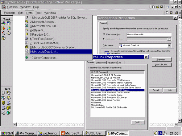 СоединенияСоединение как компонент пакета представляет собой описание источника или назначения, использующихся при переносе данных или других задач. В дальнейшем для краткости мы иногда будем употреблять термин "источник" независимо от того, идет ли речь об источнике или назначении. Соединение с источником осуществляется через OLE DB, следовательно DTS может работать с источниками данных любого типа и формата, в том числе нереляционными, для которых существует OLE DB-провайдер (или ODBC-драйвер, так как в этом случае будет задействован MSDASQL - OLE DB-провайдер для ODBC). Наиболее часто встречающиеся типы источников имеют в DTS предопределенные соединения, что означает, что соединение уже почти полностью инициализирует провайдера, оставляя пользователю ввести DATASOURCE или какую-то часть PROVIDERSTRING. К таким источникам относятся различные версии MS SQL Server, Oracle, Excel, Access, Paradox, dBase и текстовые файлы. Для остальных требуется описание ODBC DSN (тип - Other Connection) или OLE DB-соединения через Microsoft Data Link (.udl-файлы). Последние позволяют провайдеру настроить пользовательское интерфейс для конфигурирования соединения. SQL Server 7.0 поставляется с OLE DB-провайдерами для SQL Server, OLAP Services, Jet версий 3.51 и 4.0, Index Server, Site Server, Oracle, ODBC и некоторыми другими, например, для самих DTS. Таким образом, все перечисленные источники доступны и могут быть использованы при работе DTS. В настоящее время число ресурсов, для которых написаны OLE DB-провайдеры, перевалило за полсотни и продолжает расти. Понятно, что всех их включить в SQL Server нереально. Поэтому, если Вам требуется соединение с ресурсом, OLE DB-провайдер для которого не включен в комплект поставки SQL Server 7.0 и не выпускается фирмой-производителем Вашей СУБД, следует обратиться на страницу http://www.microsoft.com/data/oledb/ products/product.htm, где приведен максимально полный список доступных OLE DB-провайдеров для всех распространенных источников данных, таких, как Sybase, Informix, DB2, Rdb, Ingres, Red Brick, Non-Stop SQL, Adabas, Jasmine, FoxPro, Clipper, VSAM AS/400, Lotus Notes, MS Exchange, службы каталогов NetWare и Windows NT и др., производства как Microsoft, так и других фирм, например, ISG, Intersolv, Object Design Inc., Sagent Technology, Sequiter, X-Tension и т.д. В более сложных ситуациях, например, когда Вы работаете с источником данных собственной архитектуры и разработки, OLE DB-провайдер придется писать самим с помощью Data Access SDK (входит в состав Microsoft Data Access Components 2.1, может быть свободно скачан с http://www.microsoft.com/data/download.htm). Пример создания соединения в DTS Designer показан на рис.1.