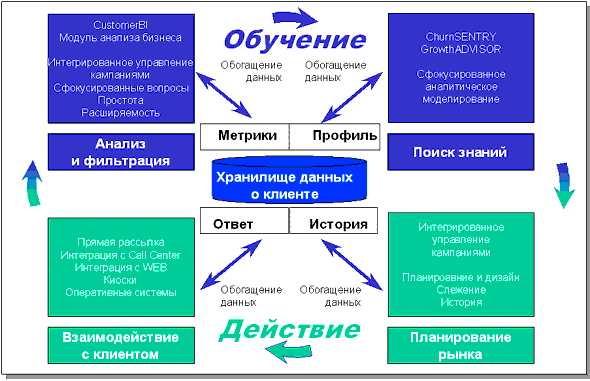 Решение NCR по созданию систем CRM является итеративным процессом, который превращает информацию о клиентах во взаимоотношения с клиентами. Этот процесс начинается с фазы "Поиска знаний" - процесса накопления знаний о клиентах, продолжается фазой "Анализ и фильтрация", замыкая круг и начиная процесс снова с использованием отфильтрованных данных, полученных во время фазы "действия". Процесс состоит из следующих фаз: Поиск знаний - анализирует информацию о клиенте для определения специфических возможностей рынка и стратегий инвестиций. Это производится путем процесса идентификации клиентов, их сегментации и прогнозирования. Этот этап расширяет возможности персонала, ответственного за маркетинг, доступом к детальной информации о клиентах для более эффективного принятия решений. Планирование рынка - определяет специфические предложения клиентам, каналы продажи продуктов и предоставления услуг, временные рамки и различные факторы, от которых зависит поведение рынка. Планирование рынка позволяет персоналу, ответственному за развитие стратегии построения отношений с клиентами, определить отдельные типы кампаний, каналы распространения продуктов и услуг, планы по взаимодействию с клиентами, а также условия для проведения отдельных мероприятий. Взаимодействие с клиентами - включает взаимодействие с клиентами или потенциальными клиентами, управление процессом взаимодействия с применением правильной своевременной информации и предложений, продвигаемых с использованием различных каналов и приложений, включающих системы обслуживания клиентов, продаж и другие интерактивные приложения. Анализ и фильтрация - это процесс непрерывного исследования клиентов путем получения данных через взаимодействие с клиентами и их анализа, а также путем фильтрации информации о клиентах на основе определенных ответов. Компоненты портфеля приложений CRM Портфель решений NCR состоит из следующих стандартных приложений, которые составляют основу нашего решения CRM. В сердце нашего портфеля решений находятся "Базовые приложения", которые являются общими для всех аспектов портфеля и выступают в качестве основного строительного блока, позволяющего каждому пакету решений функционировать как отдельному предложению или в качестве компонента, интегрированного в целое решение. Решение NCR ChurnSENTRY и GrowthADVISOR (CS/GA) - предоставляет два отдельных решения с фиксированной ценой и фиксированным содержанием, которые адресуют ключевые вопросы бизнеса в областях оттока клиентов в сегменте частного сектора и малого бизнеса, а также роста клиентской базы. Это выполняется с помощью следующих стандартных приложений: Решение по интегрированному управлению маркетинговыми кампаниями (Campaign Management - CM) - программное обеспечение ValEX компании-партнера Exchange Applications Inc. интегрировано в решение NCR для предоставления возможности интегрированного управления маркетинговыми кампаниями на основе физической реализации хранилища данных о клиентах. Были также разработаны другие утилиты для предоставления еще одного замкнутого цикла, позволяющего помещать данные о прошедших кампаниях назад в хранилище данных для их последующего анализа. Решение CustomerBI (Business Intelligence) - используя продукты PowerPlay и Impromptu компании Cognos, предоставляет предопределенные аналитические отчеты о бизне