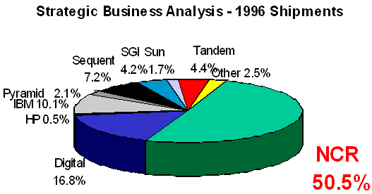Рисунок 4. "Рынок высокопроизводительных коммерческих систем, обзор и прогноз на 1995-2000", IDC, июль 1996 Список наших клиентов в области хранилищ данных включает крупнейшие мировые компании. Список, приведенный ниже, представляет некоторые из более чем 800 производственных хранилищ данных NCR, 200 из которых представлены компаниями группы Fortune 500 (Рисунок 5). Размер этих хранилищ данных варьирует в пределах от 30 Гигабайт до 24 Терабайт.