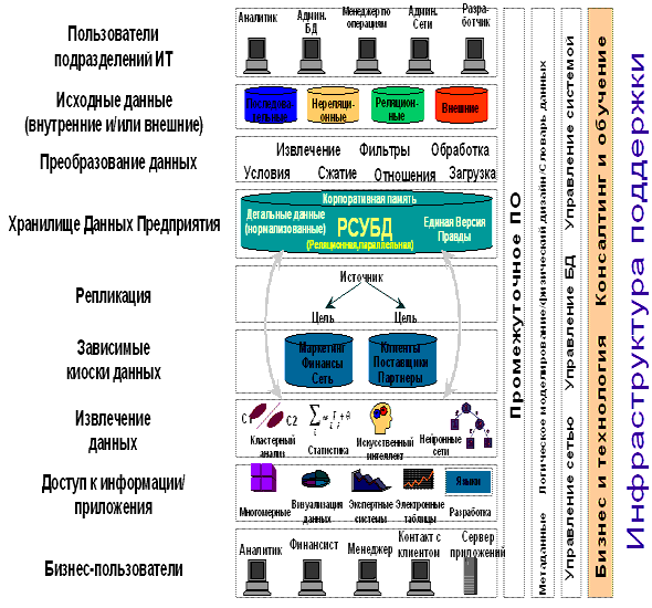 Рисунок 5. Некоторые клиенты NCR в области хранилищ данных Наш персонал Несмотря на то, что к созданию хранилищ данных проявляется огромный интерес, не всегда в достатке существует опытный персонал, способный разъяснить, построить и поддерживать хранилища данных. Имея почти пятнадцатилетний опыт внедрения хранилищ данных, помогающих использовать всю мощь детальных данных, компания NCR имеет уникальную возможность помочь клиенту разработать свое успешное хранилище данных. В течение последних 15 лет консультанты NCR в области хранилищ данных были самыми лучшими в разработке и внедрении решений по созданию систем поддержки принятия решений (хранилищ данных). Они не только знают, что необходимо сделать, но и то, чего делать не нужно. Это исключает риск затяжных проектов с перерасходом бюджета, которые часто ассоциируются с проектами по созданию хранилищ данных. В дополнение к этому, их услуги основываются на проверенной методологии разработки, включающей оценку, дизайн решения, оценку его влияния и поддержку решения. Одна из сильных сторон компании NCR - это использование консультантов, имеющих опыт в построении хранилищ данных, в особенности, в моделировании и преобразовании данных. Моделирование и преобразование данных являются критическими элементами, которые могут оживить или уничтожить весь проект по построению хранилища данных. Успех в этих областях зависит почти полностью от знаний, навыков и опыта используемых профессиональных консультантов. В нашем распоряжении имеется более 400 опытных консультантов в области хранилищ данных, которые способны ответить на ваши вопросы, когда и где вам это нужно. Имея за плечами в среднем по 7 лет опыта в построении хранилищ данных и 15 лет общего опыта оказания консультационных услуг, они помогут вашей группе добиться успеха. Наша методология Мы верим, что клиент должен сконцентрировать усилия на хранении чистых не агрегированных данных. Из этого центрального хранилища на уровне департамента или всего предприятия можно выполнять запросы любой сложности. Схема, приведенная ниже (Рисунок 6), является логической схемой завершенного хранилища данных. Вне зависимости от продуктов и утилит, выбранных для реализации каждого слоя, слой важен сам по себе с точки зрения законченности реализации хранилища данных. Существует богатый набор утилит, которые можно использовать на всех уровнях этой схемы. Большинство производителей утилит, предлагающих на рынок "хранилища", продают всего лишь утилиты для реализации отдельных процессов и не обсуждают объемлющие проблемы, вовлеченные в создание решения, предоставляющего наиболее эффективное использование информации в вашем бизнесе. NCR будет работать совместно с клиентом для интеграции всех необходимых связующих звеньев, обеспечивая тем самым беспрепятственное внедрение и почти неограниченный рост. Консультационные услуги NCR в области создания хранилищ данных на всех фазах помогают нашим клиентам в понимании, разработке, внедрении и поддержке хранилища данных. Наш опыт охватывает широкомасштабные консультационные услуги, поиск возможностей для бизнеса, которые могут быть реализованы при помощи хранилищ данных, а также внедрение и расширение хранилищ данных. Консультационные услуги NCR в области создания хранилищ данных концентрируются