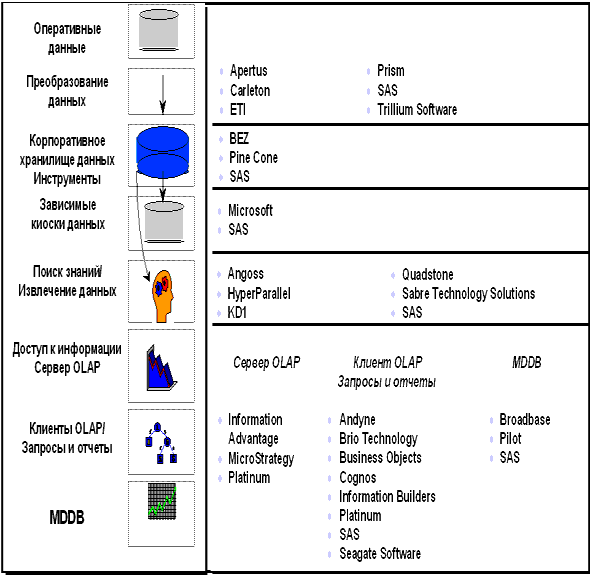 Рисунок 6. Схема масштабируемого хранилища данных NCR Наши партнеры по технологии Ведущие технические решения по созданию хранилищ данных компании NCR стали возможными благодаря нашим партнерам с лучшими технологиями и услугами в области преобразования данных, извлечения данных, доступа к информации и ее анализа (генерация отчетов и запросов), доступа через сеть Internet и аналитического моделирования. На приведенном ниже рисунке (Рисунок 7) изображены партнеры компании NCR, предлагающие свои решения на различных слоях схемы хранилища данных NCR.