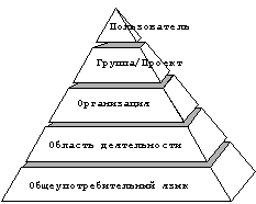 Система RetrievalWare позволяет одновременно использовать несколько семантических сетей. Иерархическая организация представляемых ими словарей системы позволяет создавать "пирамиды" словарей (см. рис. 2) для тех или иных областей деятельности, организаций, проектов или даже отдельных пользователей.